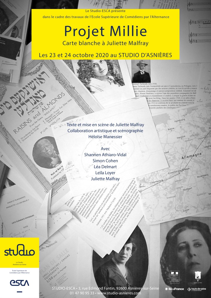 J’ai initié mon travail par une recherche historique et factuelle détaillée sur Millie. J’ai rencontré son arrière-arrière-petit-fils, Kieron Maguire en juin 2019 à Londres, qui m’a transmis des documents historiques sur sa famille. Ces documents, associés aux éléments issus de mes recherches internet, aux éléments de biographies et aux souvenirs auxquels j’ai eu accès, m’ont permis de réaliser une sorte de carnet de route d’itinéraires possibles que Millie aurait pu emprunter dans ses différentes tournées. Riche de ces informations, armée de courage et d’enthousiasme, j’ai alors entrepris un voyage sur les routes d’Europe en août 2019. Je suis allée à Varsovie, Czestochowa, Będzin, Katowice, Vienne, Prague, Berlin. Pendant une vingtaine de jours, je suis partie sur les traces de cette comédienne, en allant dans les lieux où elle a joué et où elle a vécu. Durant cette aventure, j’ai ressenti encore plus profondément qu’auparavant cette étrange sensation que les morts, les disparus, les effacés me sont autant présents que les vivants eux-mêmes. Le cheminement de mes réflexions a peu à peu trouvé le moyen de se formuler en mots : sont venues à moi les déroutes sur les routes, les questions sans réponses, les prières à des ancêtres inconnus, les révélations sur cet « âge de raison » où on questionne son identité et où on décide d’emprunter le chemin qu’on s’est choisi. Au fil de mon voyage, j’ai pu en apprendre plus sur Millie, non pas d’un point de vue intellectuel ou informatif, mais en étant « sur la route », comme elle l’a été une grande partie de sa vie. Comme Kafka, j’ai écrit un journal de bord, partageant mes émotions et mes réflexions au quotidien. C’est dans cet état que j’ai pu trouver l’endroit de parole de mon fantôme imaginaire de Millie. Et alors que je ne m’attendais à rien d’autre que ce bonheur, d’autres voix du passé ont ressurgi. Elles se sont présentées comme des spectres familiers, en quête de leur vie rêvée, de leur réussite professionnelle, de leurs origines… J’avais désormais un colloque de fantômes à satisfaire ! J’ai décidé de leur donner de la voix …